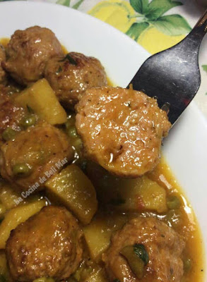 -Elaboración: Empezamos haciendo las albóndigas, en un bol grande ponemos la carne picada, añadimos la sal, la pimienta negra, el ajo pelado y picadito, las hojas de perejil lavadas y picaditas, el huevo batido, y el pan remojado con la leche, bien desmenuzado, lo mezclamos todo muy bien con la carne. Cuando esté todo bien mezclado, empezamos a hacer las albóndigas, ya sabéis, vamos haciendo bolitas con la carne y las vamos poniendo en una bandeja. Así una y otra vez hasta terminar. No vamos a usar harina para hacerlas ni para freirlas, vereis que jugosas salen, además con el huevo que hemos puesto en la carne, se despegan muy bien de las manos y así hacemos las albóndigas algo más ligeras. Una vez hechas las albóndigas, las reservamos un momento. Ahora limpiamos la cebolla, el pimiento verde y el ajo, lo lavamos todo y troceamos, el pimiento lo vamos a dejar entero, pelamos la patata, la lavamos y troceamos también, ya lo tenemos todo preparado. Ponemos una sarten al fuego con el aceite, cuando esté caliente añadimos la patata troceada, la freimos durante 5 minutos por ambos lados, para que se doren un poquito, luego la vamos a terminar de guisar. Una vez fritas las sacamos de la sarten y reservamos. A continuación freimos las albóndigas, en el mismo aceite, también hacemos lo mismo, las doramos unos 5 minutos por ambos lados, después las terminamos de guisar. Una vez fritas las albóndigas, las retiramos de la sarten y reservamos un momento. Parece un poco "trapicheoso" pero se hace todo en un pis, pas !! Ahora ponemos una cazuela, olla, sarten, lo que más os guste, al fuego, le añadimos 4 cucharadas de aceite del que hemos frito las patatas y las albóndigas, cuando esté caliente añadimos la cebolla, el ajo troceado y el pimiento verde entero, sofreímos todo durante 5 minutos. Pasado los 5 minutos añadimos las albóndigas, mezclamos muy bien todo y dejamos sofreír otros 5 minutos. Pasado este tiempo añadimos los guisantes, el vino blanco, el agua, el tomillo, la hoja de laurel, la sal y el azafrán, removemos, tapamos y dejamos cocer todo durante 20 minutos, a fuego medio, removiendo de vez en cuando y siempre vigilando. Pasado este tiempo destapamos la olla, añadimos las patatas que tenemos reservadas y dejamos cocer todo durante 15 minutos. Pasado los 15 minutos, retiramos el pimiento y un par de trocitos de patata, lo ponemos en un bol y trituramos con la ayuda de la batidora un par de minutos. Una vez triturado añadimos el contenido del bol a la olla, esto hará que la salsa se espese, removemos muy bien, subimos el fuego y dejamos cocer todo unos 5 minutos más. Una vez pasado los 5 minutos, retiramos del fuego y ya tenemos nuestras albóndigas. Las servimos en un plato y hemos terminado !! A comer !!